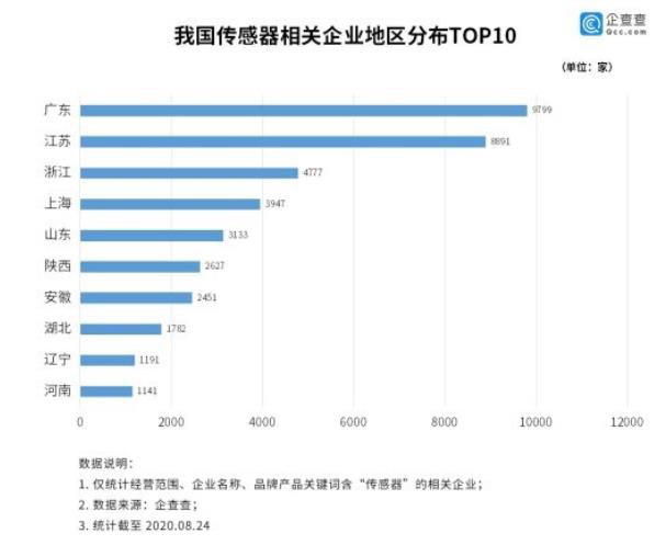 根据天燕查的数据,我国目前有4.8万家传感器相关企业,广东省排名第一,有8300多家企业和企业,江苏省和浙江省排名第二和第三。2019年,注册新公司7600多家,同比增长17.22%。2020年前三季度新增公司总数为2369家。此外,68%的制造业公司的股本不到500万。